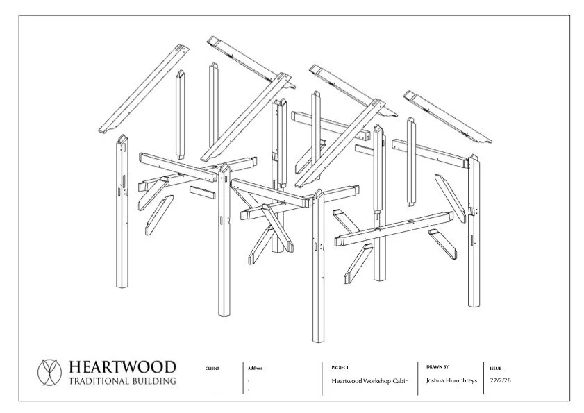 We begin by understanding the frame as a whole — how it stands, how it carries load, and how each piece works in conversation with the next. Students will be introduced to the basic layout of the Heartwood Cabin frame and the joinery details that bring it together.